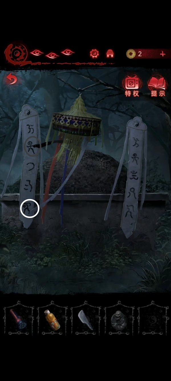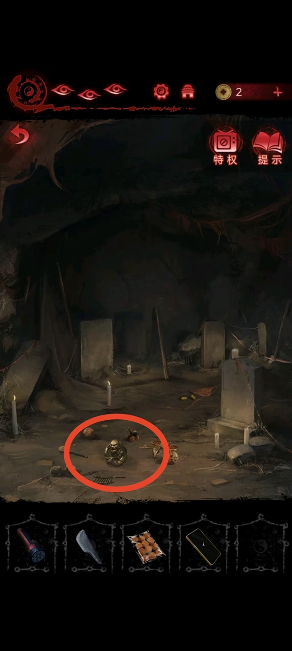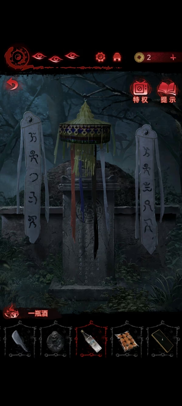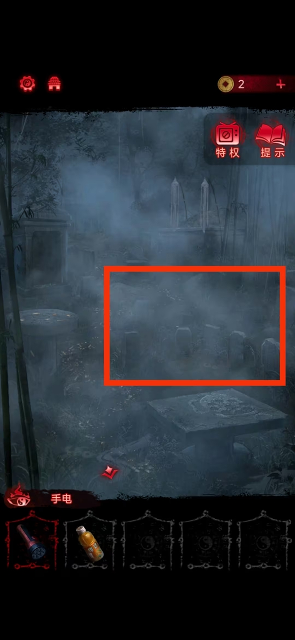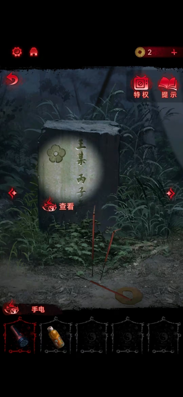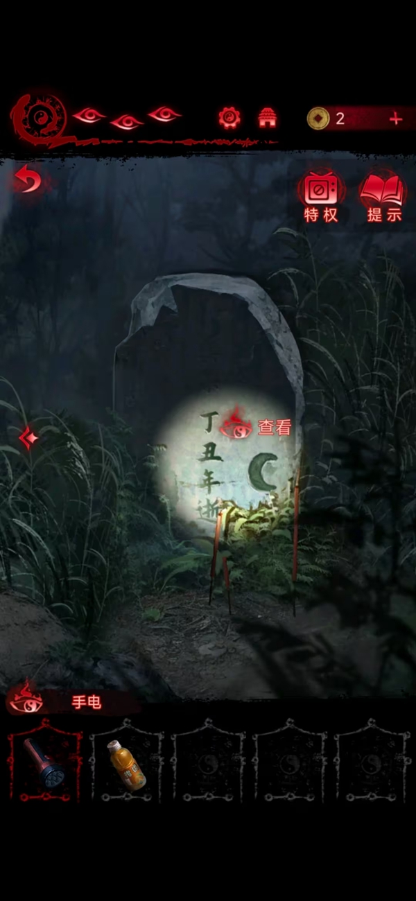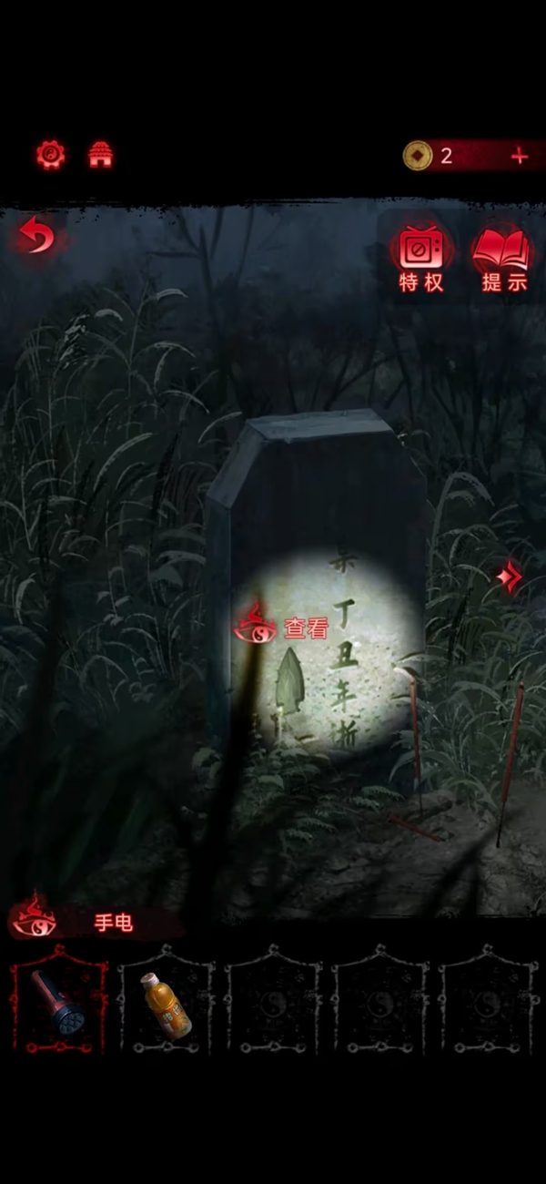 1、地上的背包获得手电和饮料后进入右边坟地,手电照墓碑获得线索。