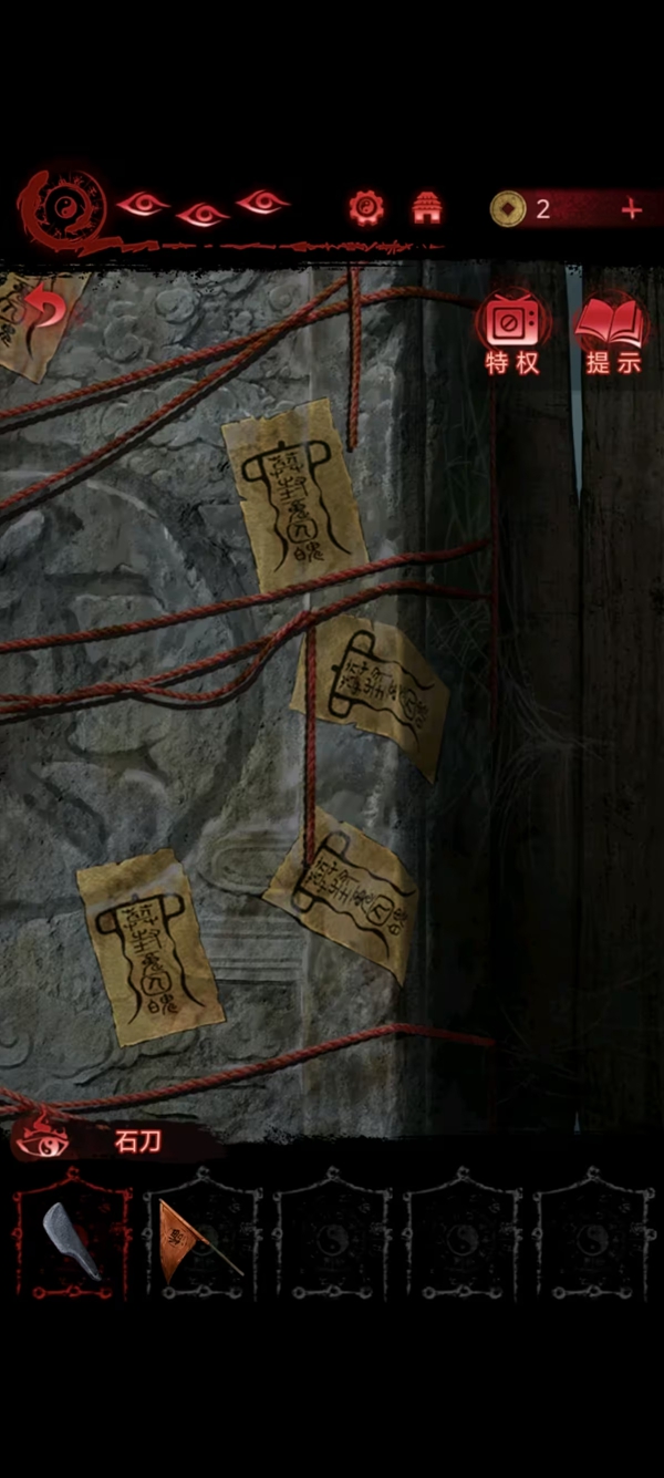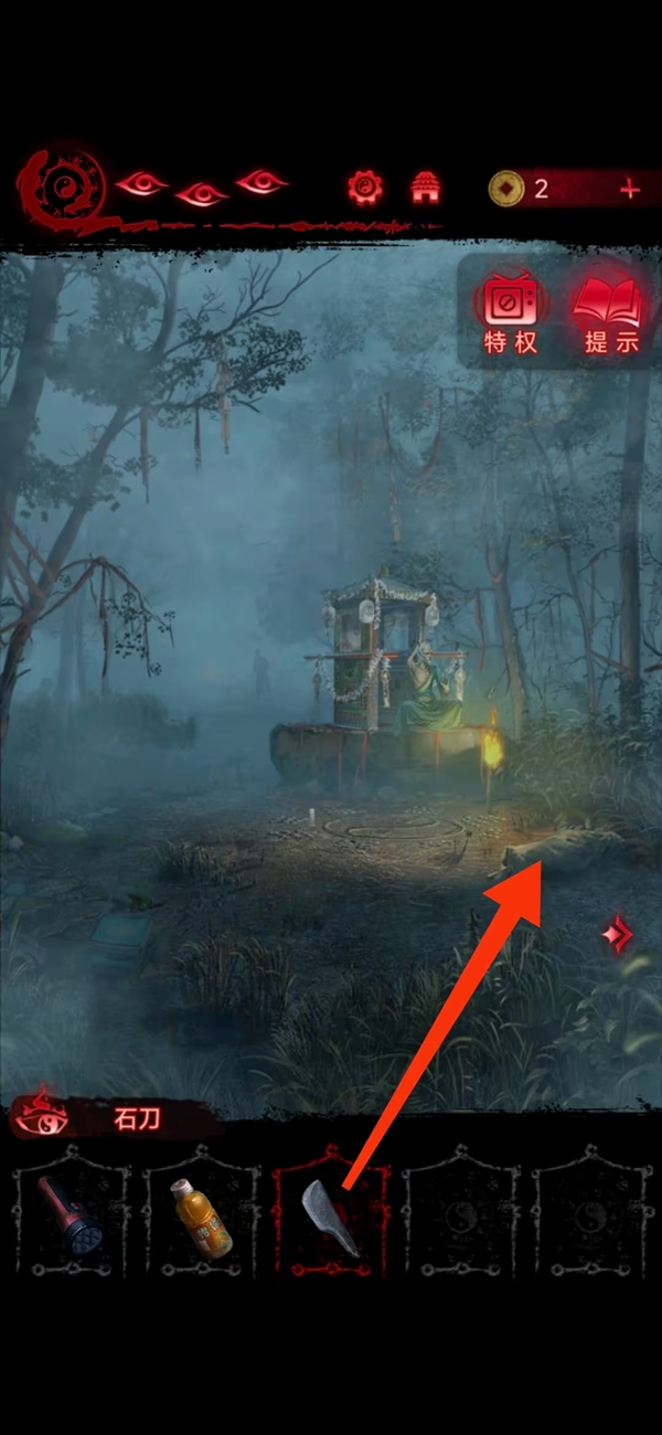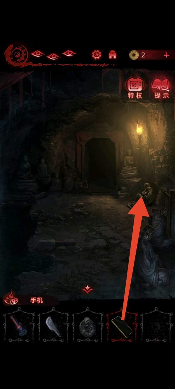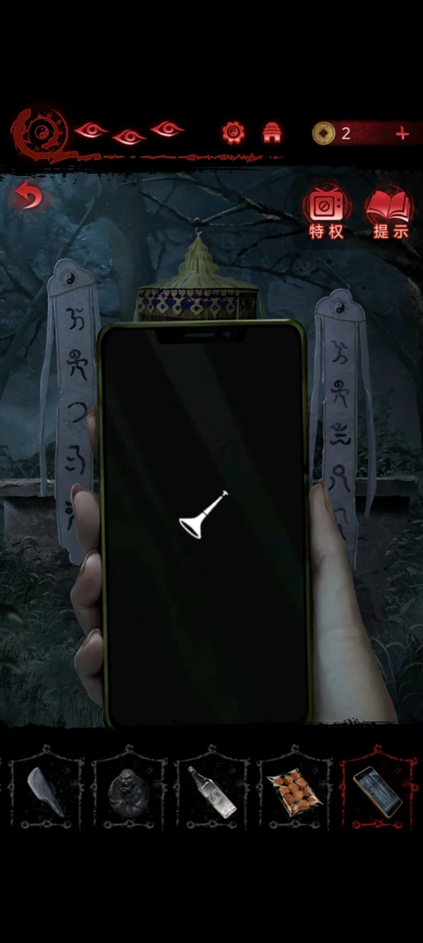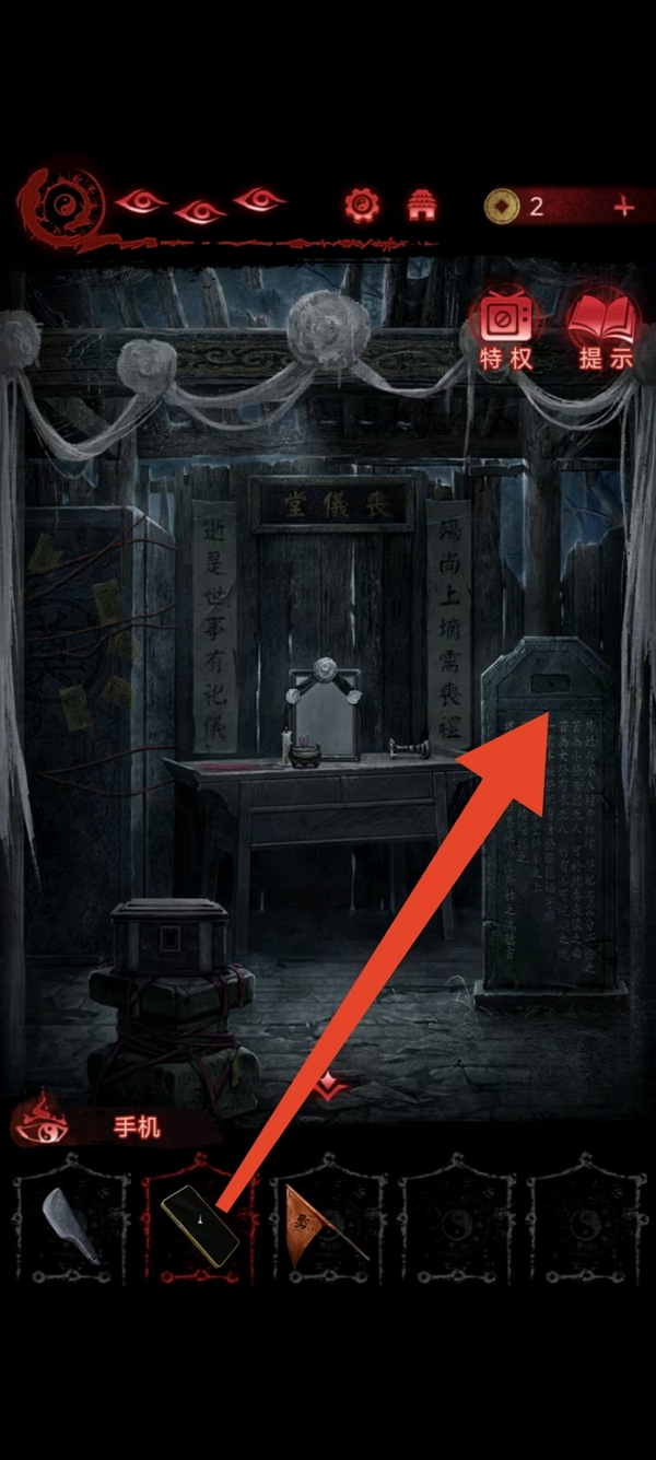 9、手机放石碑上,用石刀划开绳子获得唢呐,去手机玩小游戏获得衣服,给葬老六穿上获得蜡烛。