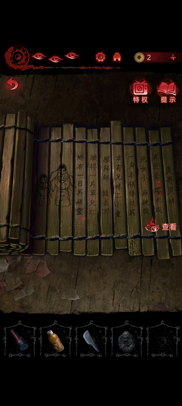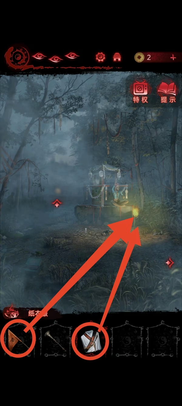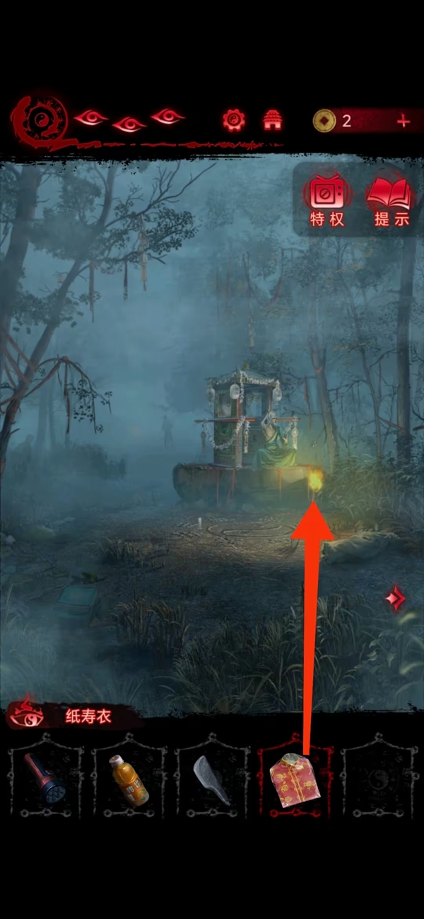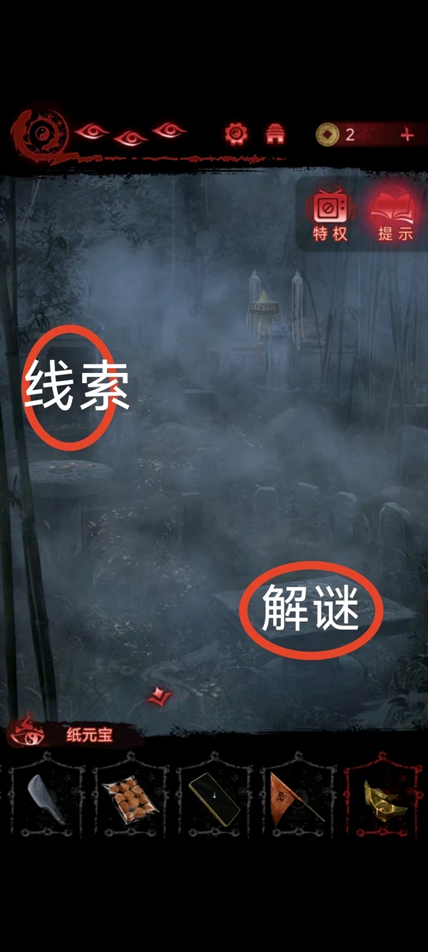 2、按照线索,找位置摆放后获得小刀,切开袋子后获得衣服,烧给葬老六之后解锁新路。