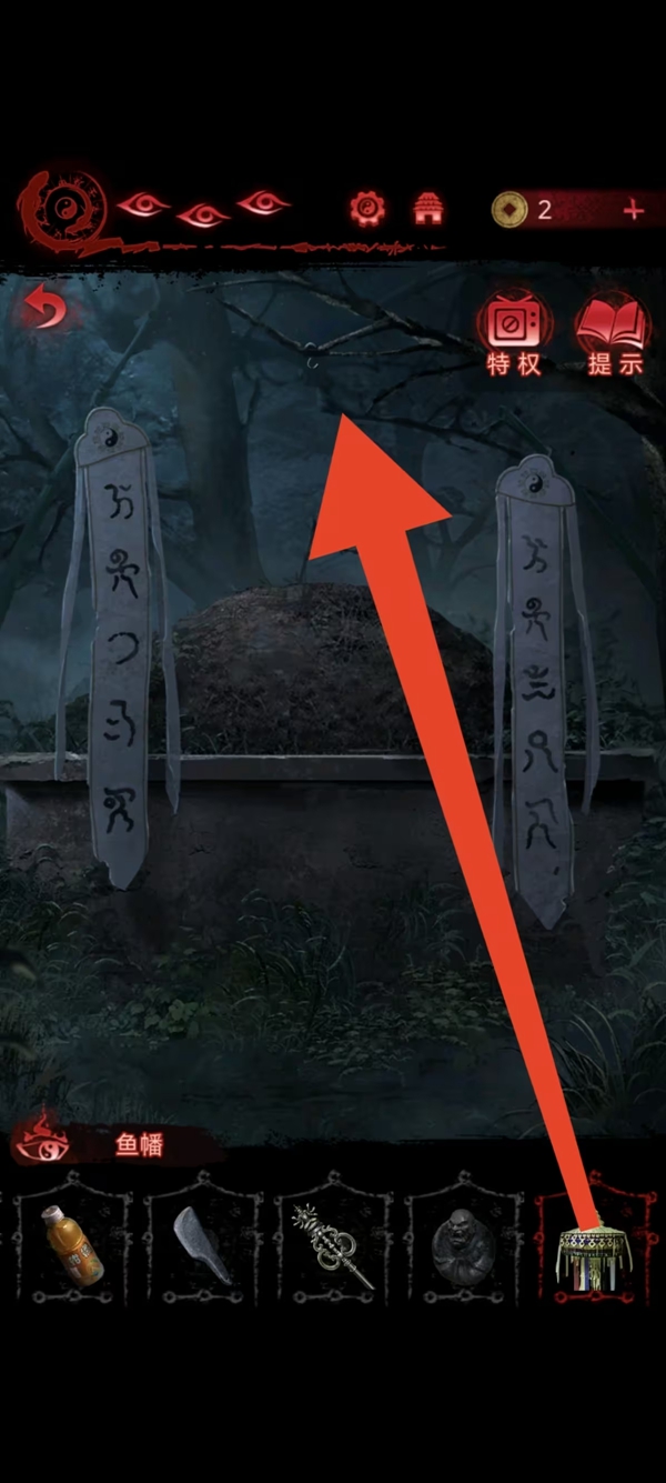 4、来到墓地,把鱼幡挂上钩子,获得提示如下图