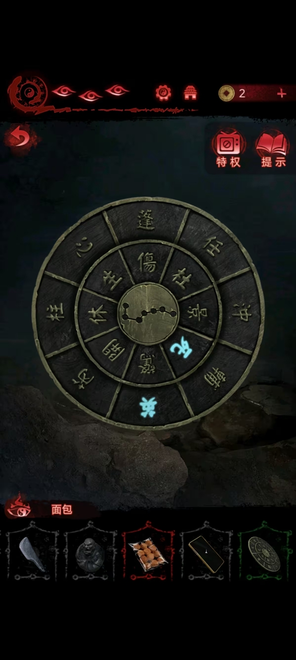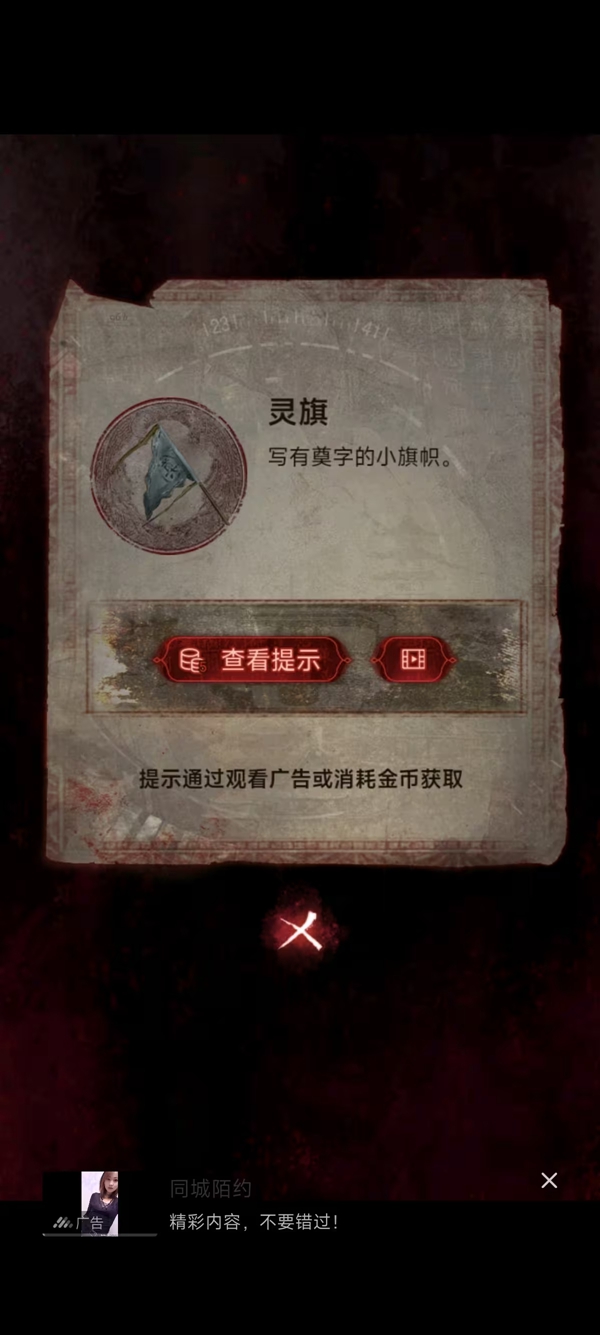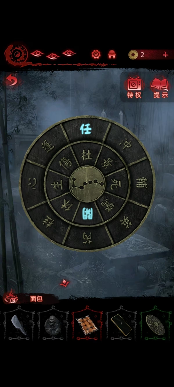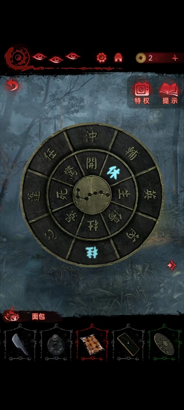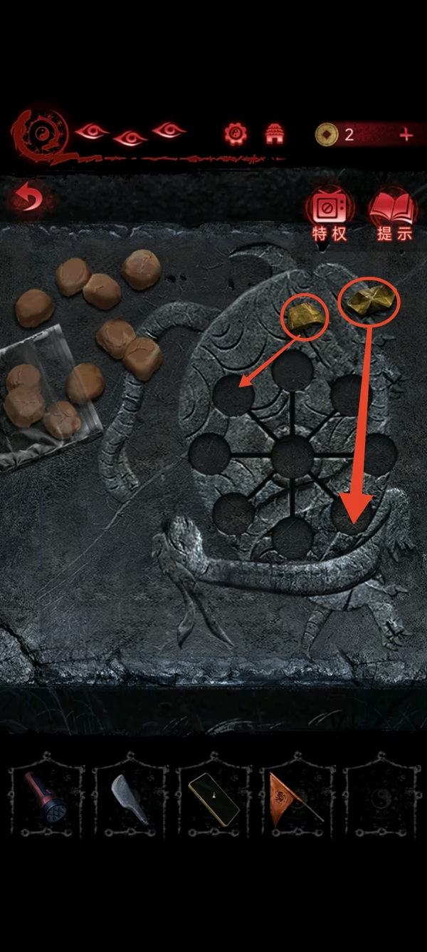8、进房间,不倒翁放玩具中间后解除空气墙,拾取中间的旗子和元宝。去墓地,先看线索后拿出面包和元宝放桌上,元宝摆放位置如线索所示摆放后解锁地图。
