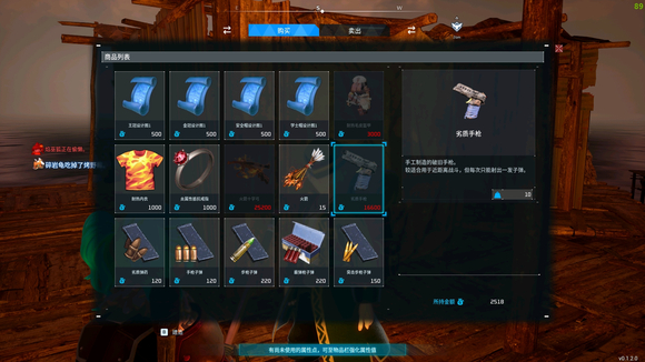 武器推荐前期弓到十字弓,然后买枪,推荐火山边远渔村商人的劣质手枪,他这里还可以买高级球和技能果实,子弹也可以买,劣质手枪和耐热金属盔甲都要25级才能解锁提前十级可以买到