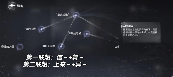 先将四个线索按如图一所示进行联想,然后去左边的电梯点调查电梯,千万别选电梯下行,然后就好啦