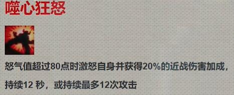 怒气值超过80点时激怒自身并获得20%的近战伤害加成,持续12秒或持续最多12次攻击。
