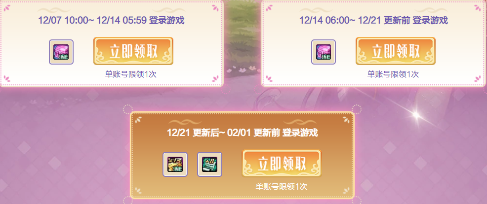 2、每个登录周期对应的奖励仅可在对应时段内领取,请务必留意及时领取。示例:12月7日10:00至12月14日5:59期间登录奖励的雾核礼盒,仅可于12月7日10:00至12月14日5:59期间在本页面领取,在其他时段无法领取。
