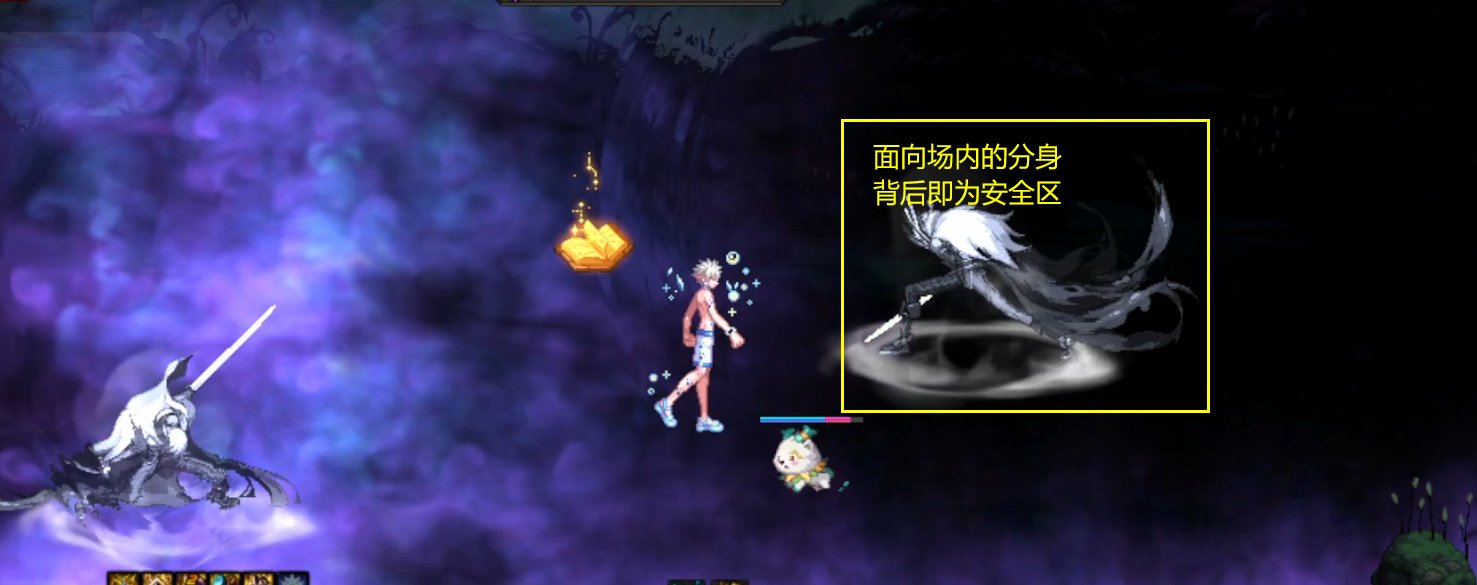 召唤一列或一圈飞镰的同时召唤分身释放前方斩击,请躲避飞镰后到分身后方躲避