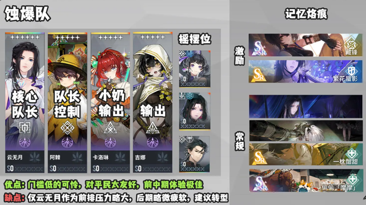 先凑激励,无论是云无月还是阿棘作为队长,都可以提供10层激励,剩下10层可以带ssr烙痕藏锋或者sr烙痕繁花蜃影补足,这两张烙痕的慢寻技能也十分契合云无月。