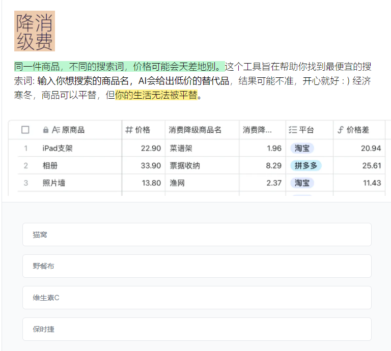 该网站可以通过用户输入名称后AI进行同类替换,以便让用户找到更优惠的选择