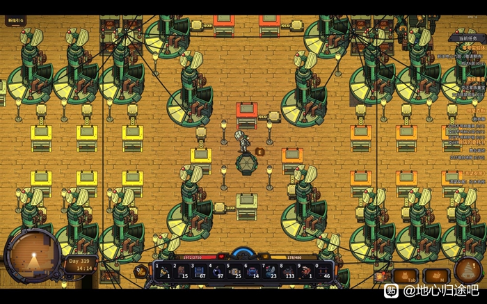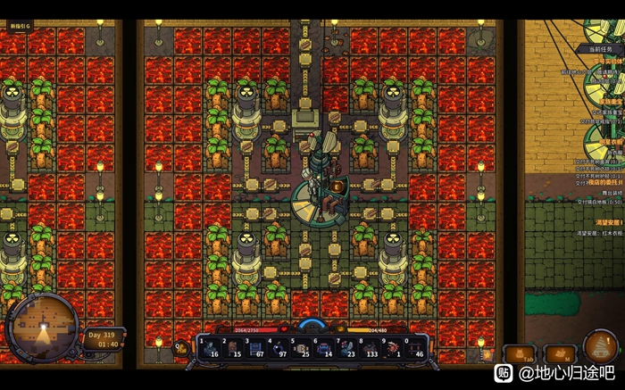 首先是万源之本——燃料自动生产机,很多人觉得火电没办法做到自动化所以会被地热淘汰,其实是错误的,有了燃料自动生产机,你就有数不尽的燃料,而且用火电开矿是远比地热开矿容易的,主要体现在不用拉电线杆,不用额外分配电力,并且由于矿是有限的,只要你算好燃料(用碎屑的话简单来算就是消耗1块碎屑,每台矿机可以采集15块矿),采完之后就完全不用管,更重要的是,火电开矿和运输塔运矿很搭!也为后续的全自动化打下了基础,话不多说,上图,原理为通过灼热地板烫掉长出的藤蔓然后用收集器收集最后运往跨层运输塔,图二传送带额外搭出去一路是为了就地供火电燃料(运输塔什么的也需要电)只造了两块燃料生产机,产能非常恐怖,供应12000电力的火电是没有问题的。