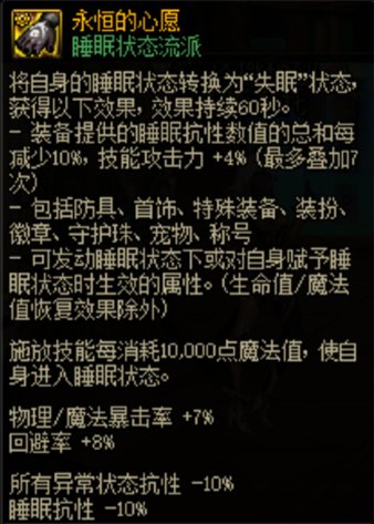睡眠流是110巴卡尔版本史诗改版后形成整体体系的流派,以伊斯大陆所产出的固定史诗[永恒的心愿]为核心,使角色进入特殊状态“失眠症”来触发各种装备属性的搭配流派。在搭配时,通过将装备的总和睡眠抗性减至-70%以下,来触发睡眠手镯的高额技攻,与其他的流派专属词条属性的各种加成。