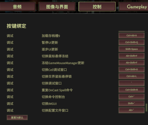 进入游戏后使用 ~ 键开启debug界面,也可以在 设置-控制 界面里修改按键。当前debug模式未进行汉化,所以界面里面几乎全是英文文本,但是对于画基地蓝图只需要极少的部分并不影响。