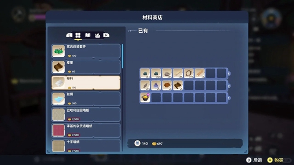 布料:家具店购入(190金币*2=380金币)/使用织布机制作,棉花可制作布料