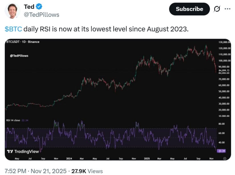 比特币日线RSI跌至2023年8月以来最低,显示深度超卖。来源:@TedPillows via X
