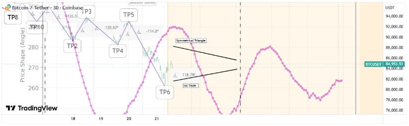 比特币对称三角形态预示市场犹豫,突破前交易风险较高。来源:Blayno_MTOPS on TradingView