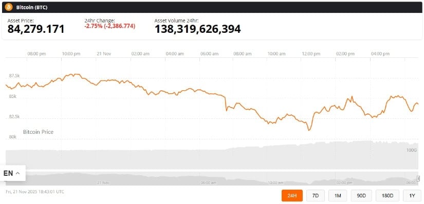 发稿时比特币报84,279美元,24小时跌幅2.75%。来源:Brave New Coin比特币价格