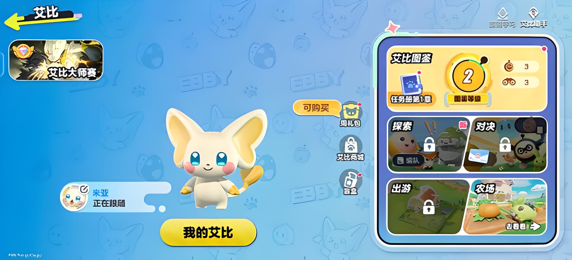 2、艾比为核心精灵角色外形技能各具特色,初始伙伴米亚有白黄颜色外观尖耳造型,所有艾比均可跟随玩家,陪伴参与各类活动进程。