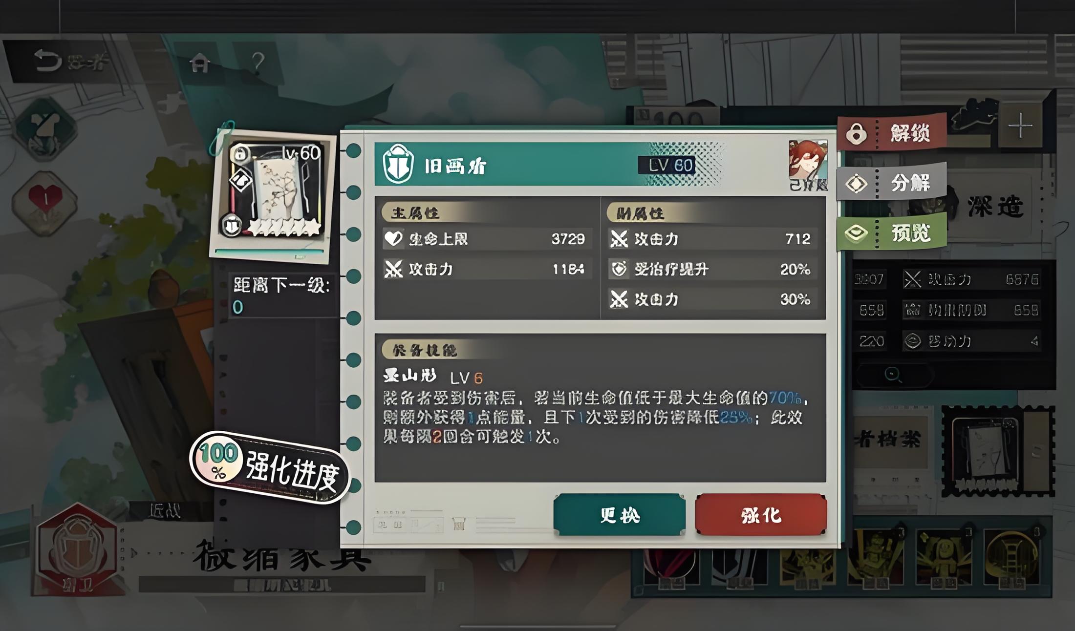 5、培养聚焦迅疾方向提升攻击与速度,考核拉满保障基础属性,装备优先旧画盾兼顾生存与能量,词条以双攻击为主。