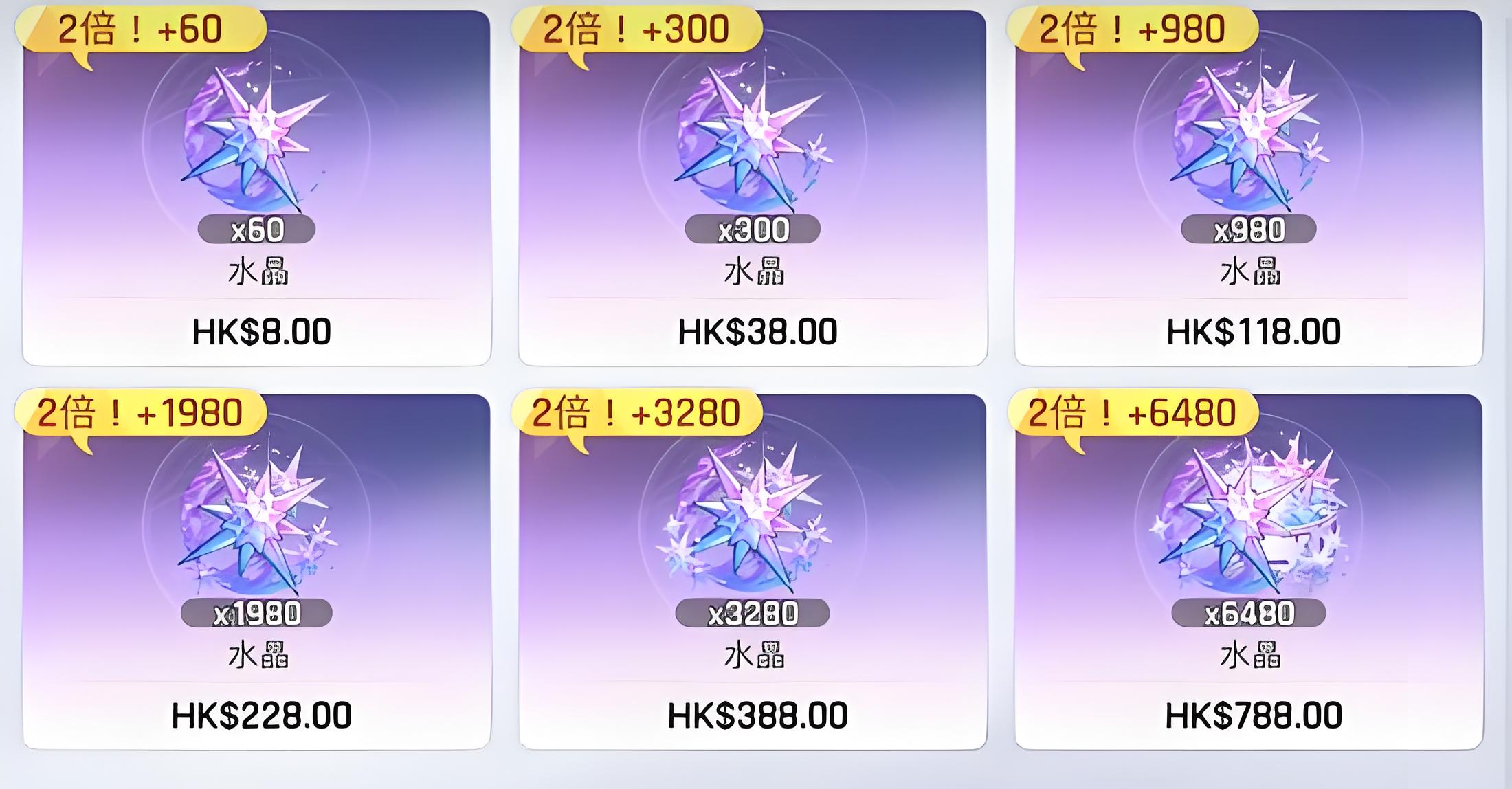 3、水晶充值提供多档选项均含2倍额外福利,从HK8到HK788不等,另有月卡限时限购礼包等道具助力角色养成与外观解锁。