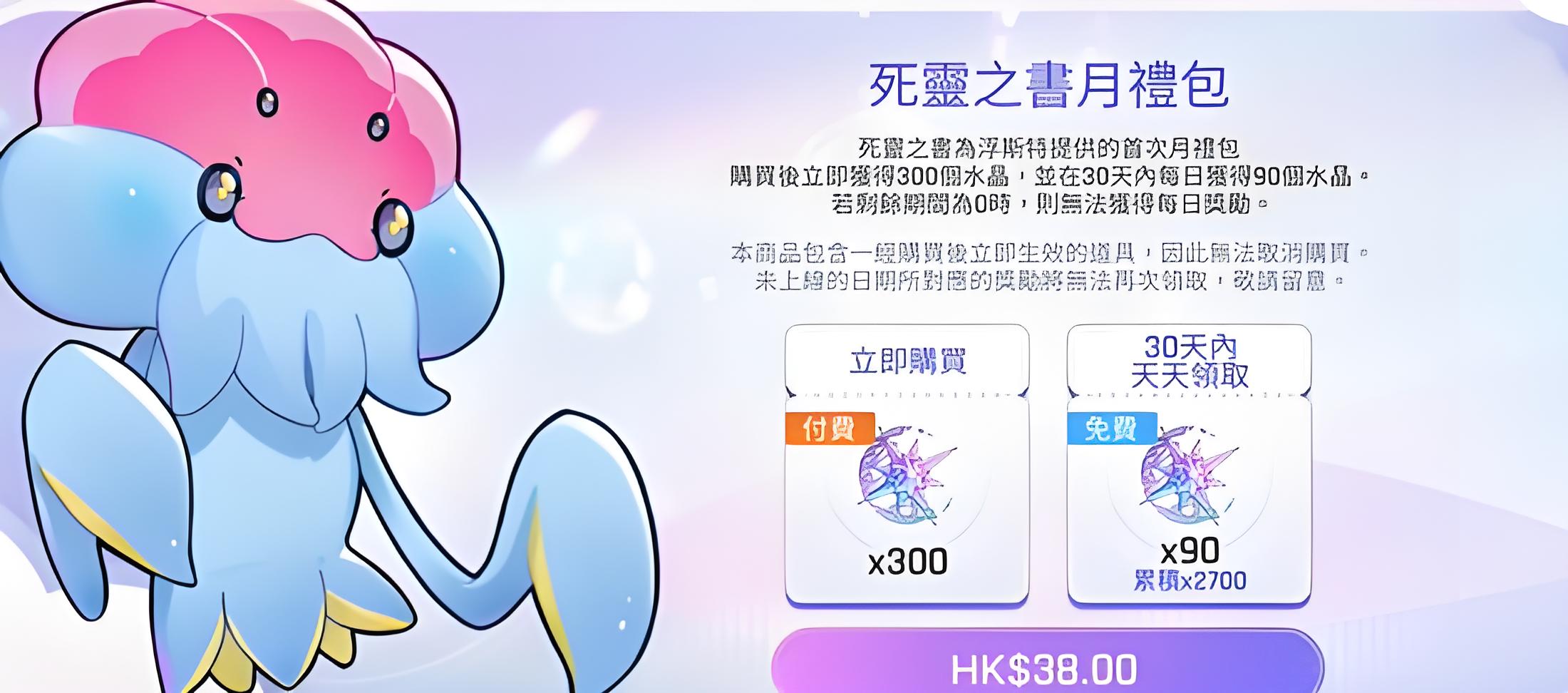 4、死灵之书月礼包售价HK38,购买即得300水晶,后续30天每日额外领取90水晶,累计可获2700水晶但不可取消购买。