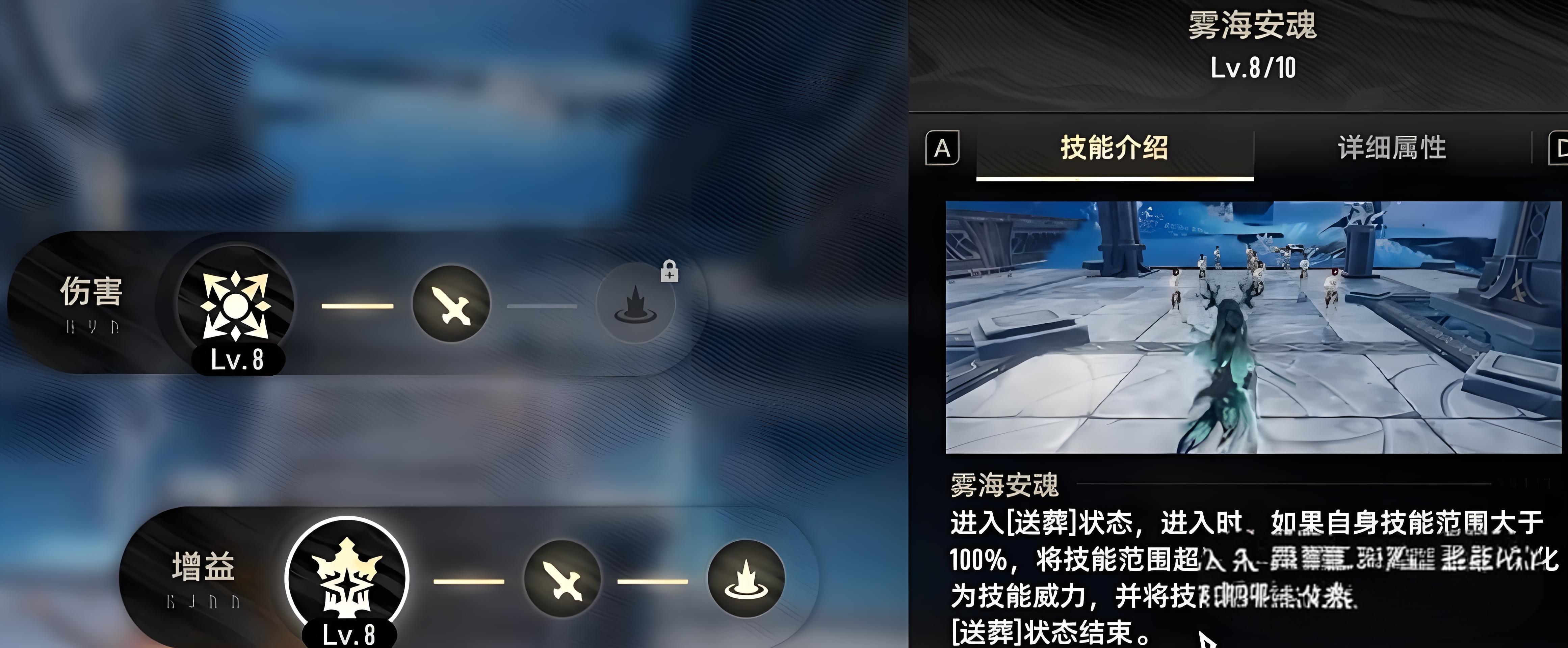 2、专属增益技能雾海安魂发动后进入送葬状态,超额技能范围转化为威力,缩减范围至百分百集中火力,提升远程武器触发概率且释放不耗神智。