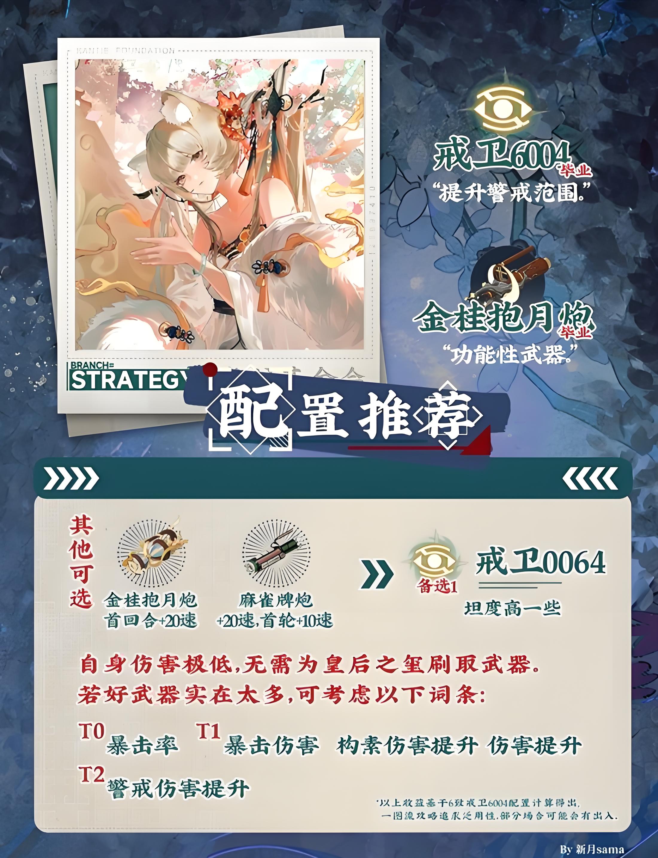 3、武器首选金桂抱月炮首回合加20速,备选麻雀牌炮,装备推荐戒卫6004,无需专门刷取武器可按需选择词条。
