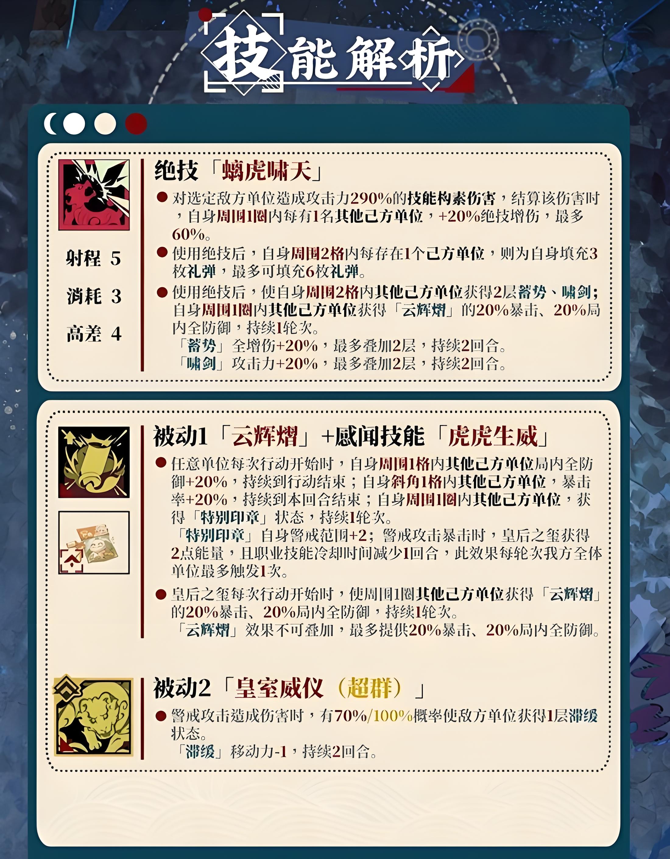 1、焕彰后基础速度165为高速水平,是唯一群体蓄势啸剑拐,提供20%暴击率20%局内全防御,还能扩大战略角色警戒范围。