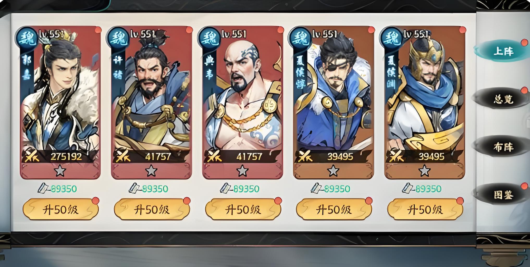 4、推荐搭配为许褚典韦郭嘉夏侯淳夏侯渊,许褚前排施加寒冰,双夏侯强化覆盖率,郭嘉控场典韦输出,初期可用曹仁替代部分武将。
