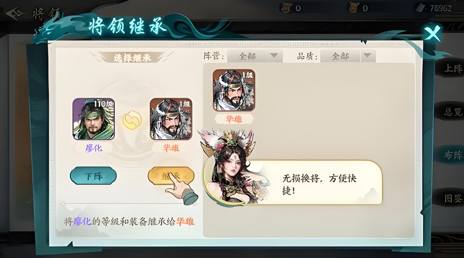5、支持将领等级无损继承,培养成本低转型灵活,无需担心武将替换带来的资源浪费,特别适合新手玩家稳步发展逐步完善阵容。