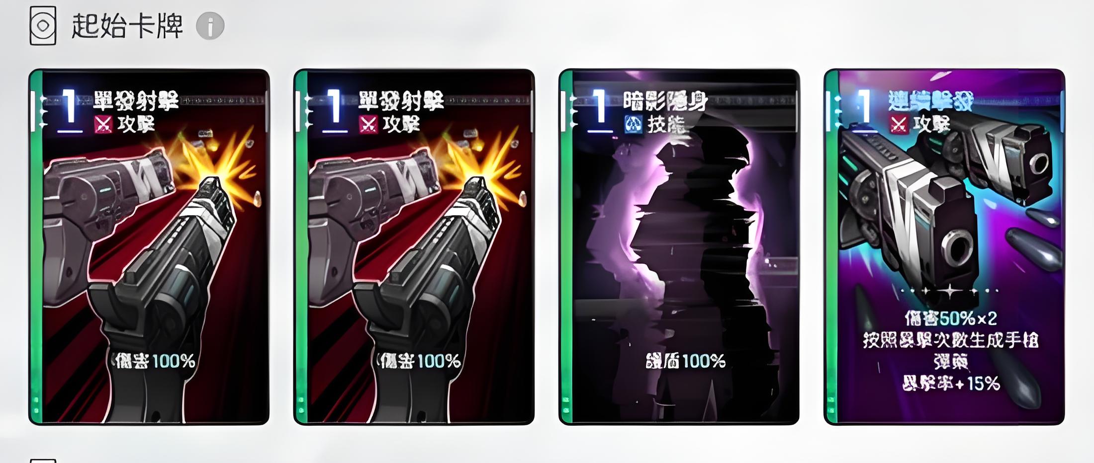 3、卡牌配置实用,一费暗影隐身技能生成护盾提升存活率,初始攻击卡保证稳定输出,灵光一闪机制可赋予卡牌新效果,攻防需求均能满足。