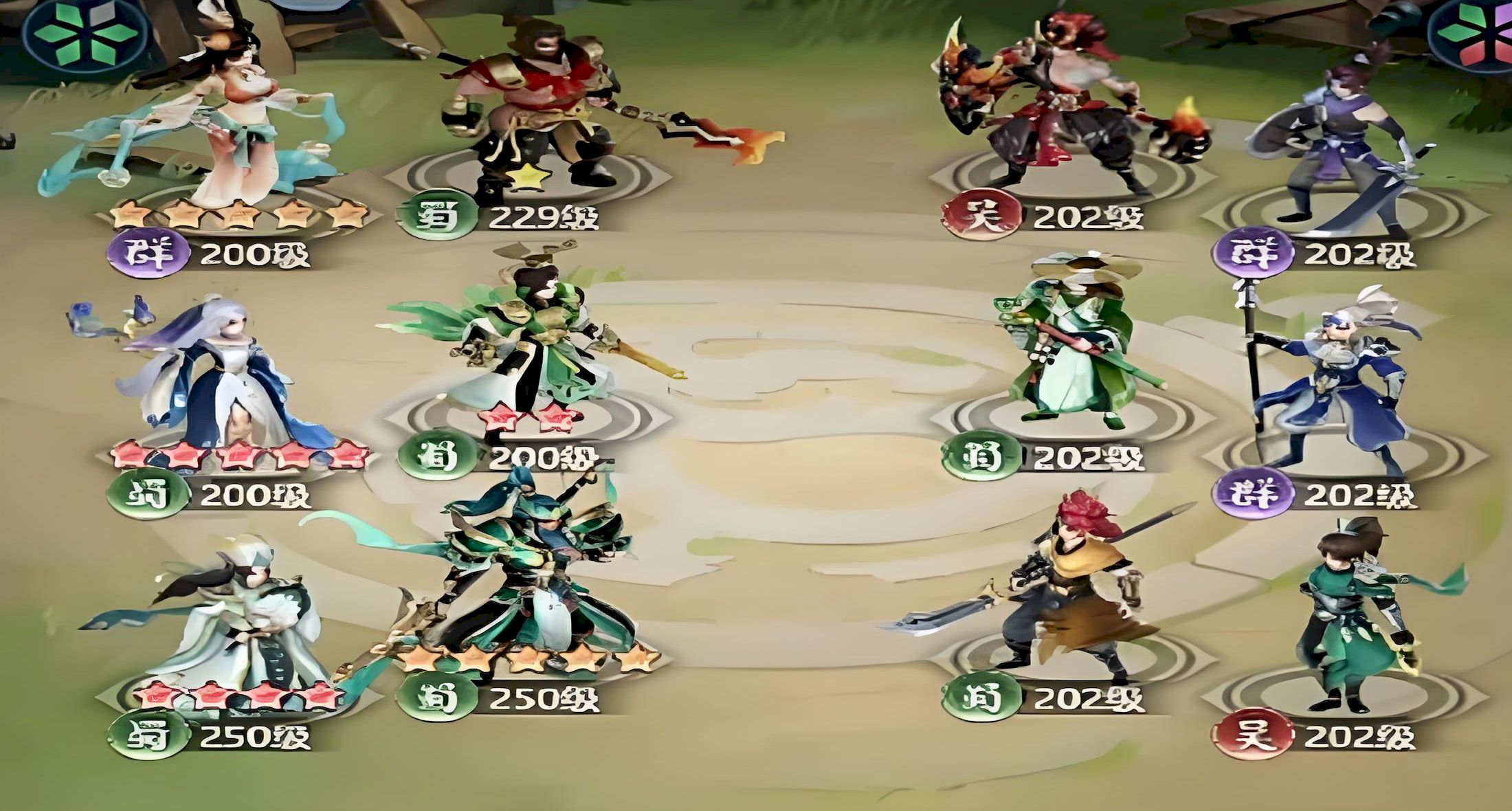 1、蜀国续航阵选关羽、张飞、刘备、蔡文姬,关羽张飞输出强劲清场迅速,刘备加攻回血双重增益,蔡文姬群体治疗稳血线。