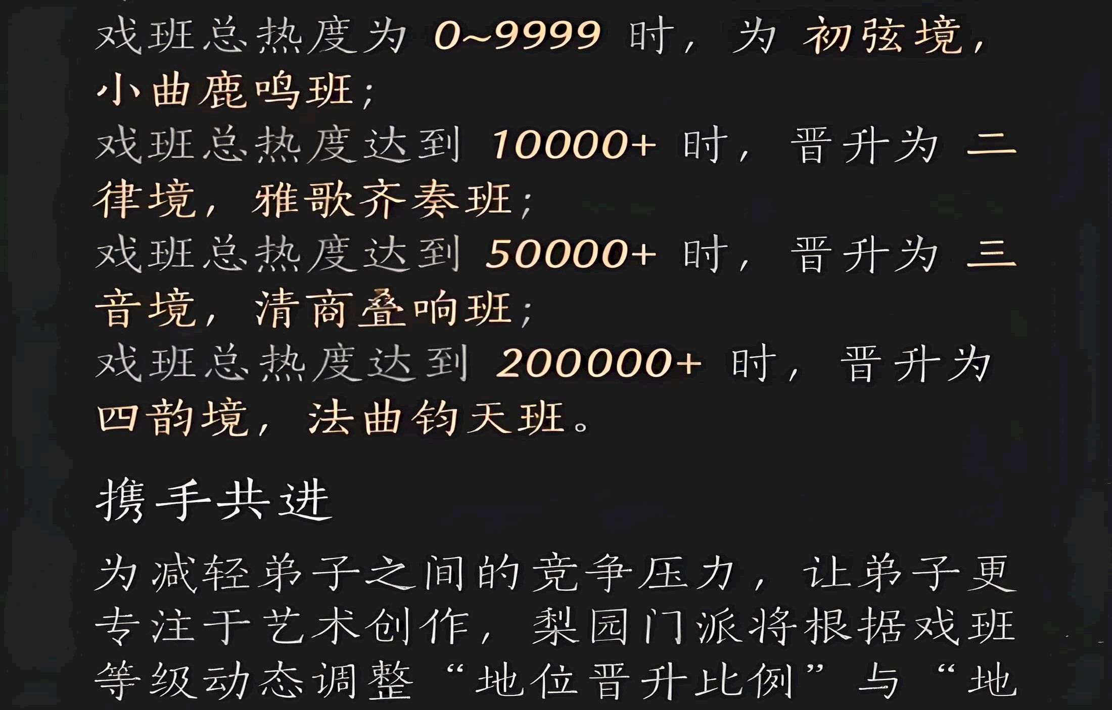 4、戏班按总热度分四档等级,从初弦境到四韵境逐步提升,四韵境戏班可实现全员晋升,无需参与个人排名竞争。