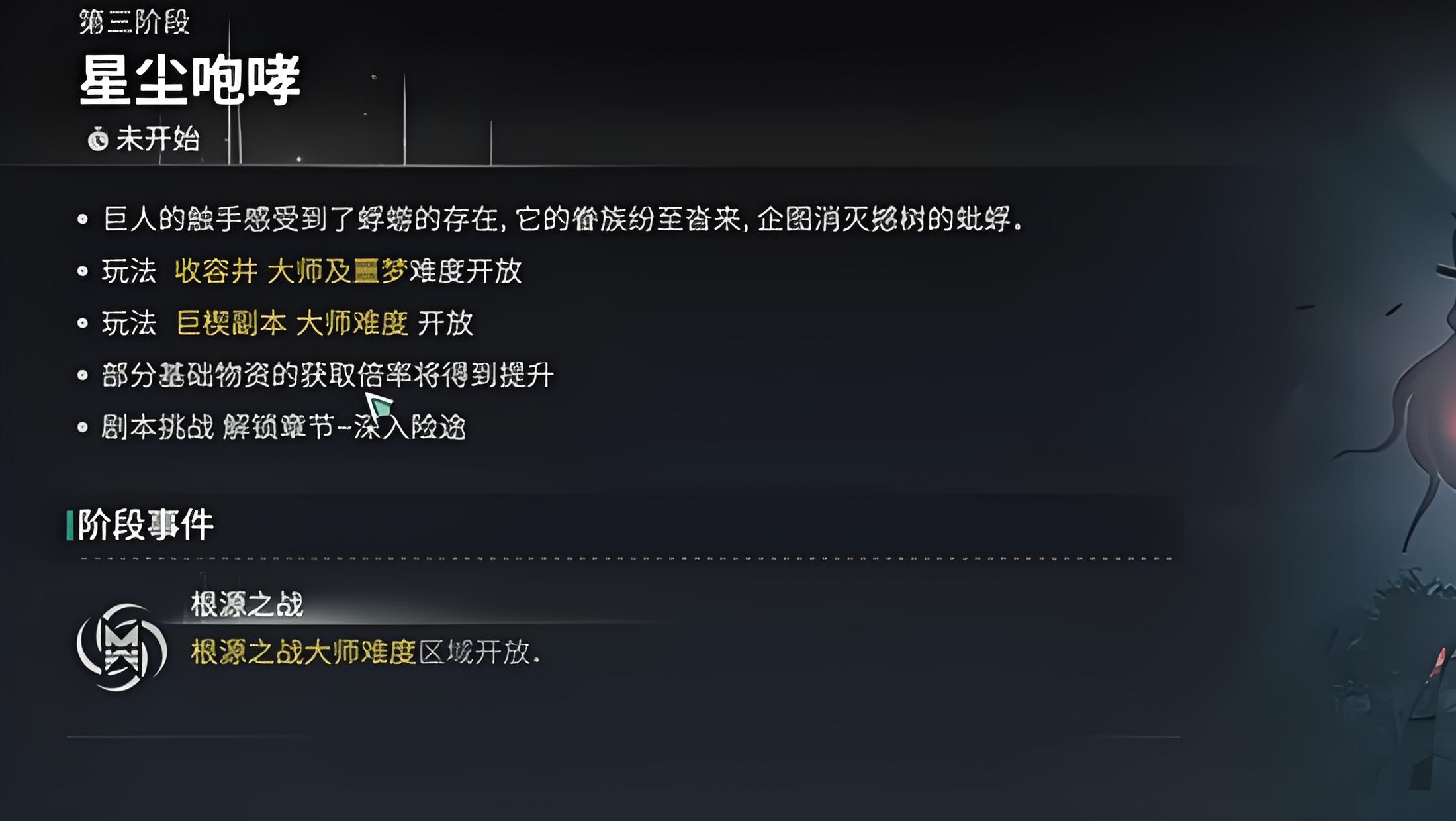 4、第三阶段为期十四天,开放更高难度副本与大师难度根源之战,物资掉落倍率上调,敌人强度增加。