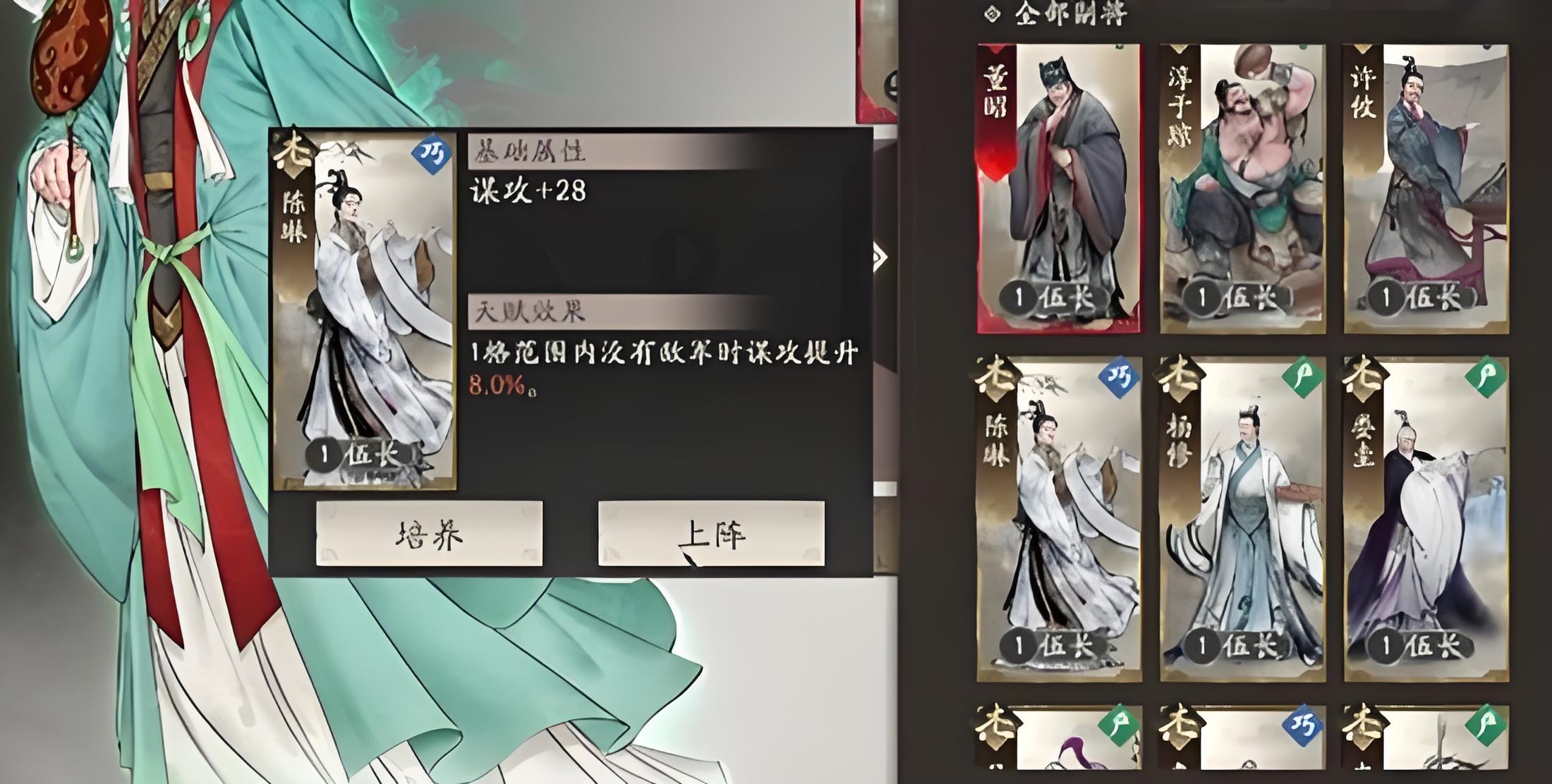 5、解锁培养有要求,角色25级后可点亮图鉴并选择搭配,前期资源有限时值得使用,后期建议替换超品质副将。