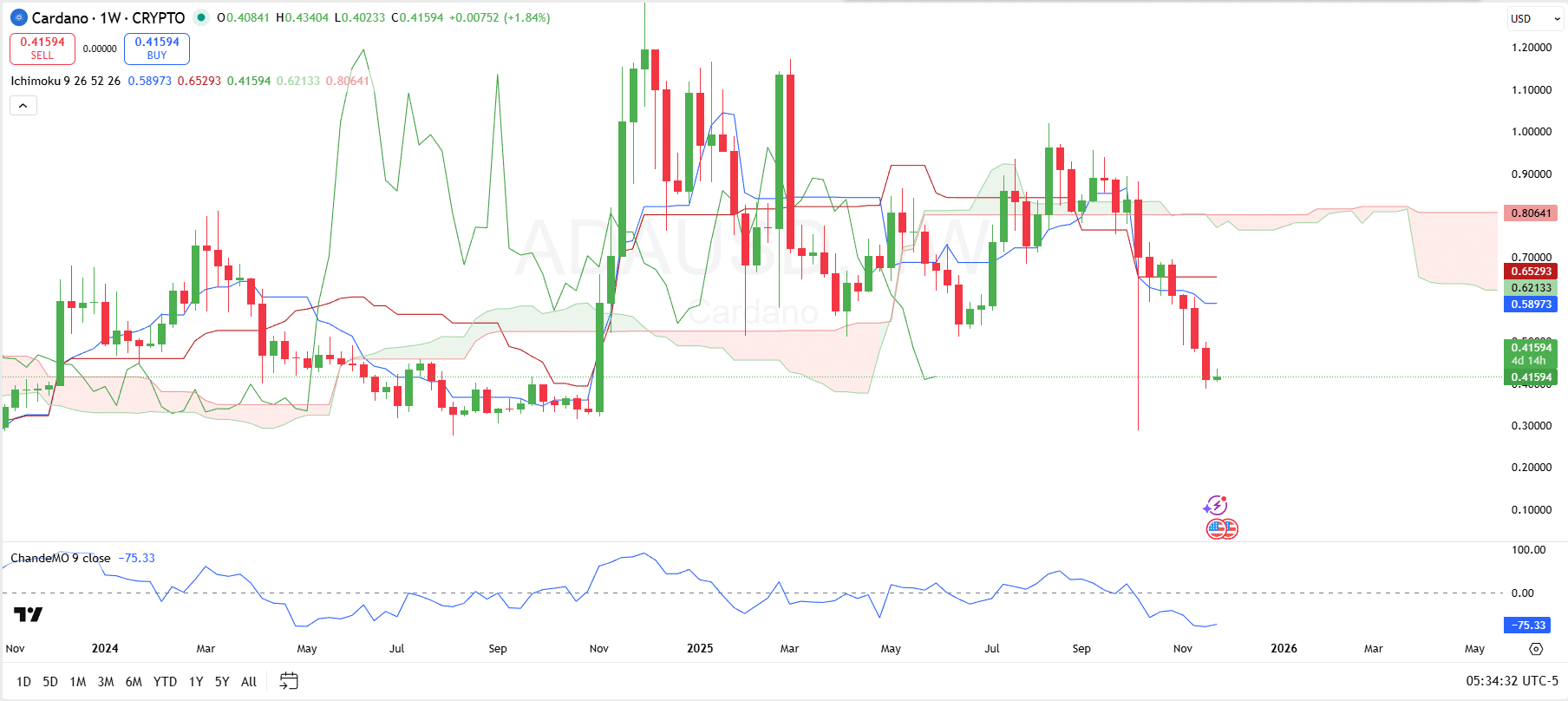 尽管当前价格试图守住支撑区,CMO读数表明ADA尚未获得有效看涨动能。价格未能收于云层上方或形成振荡器动量,预示仍需保持谨慎。