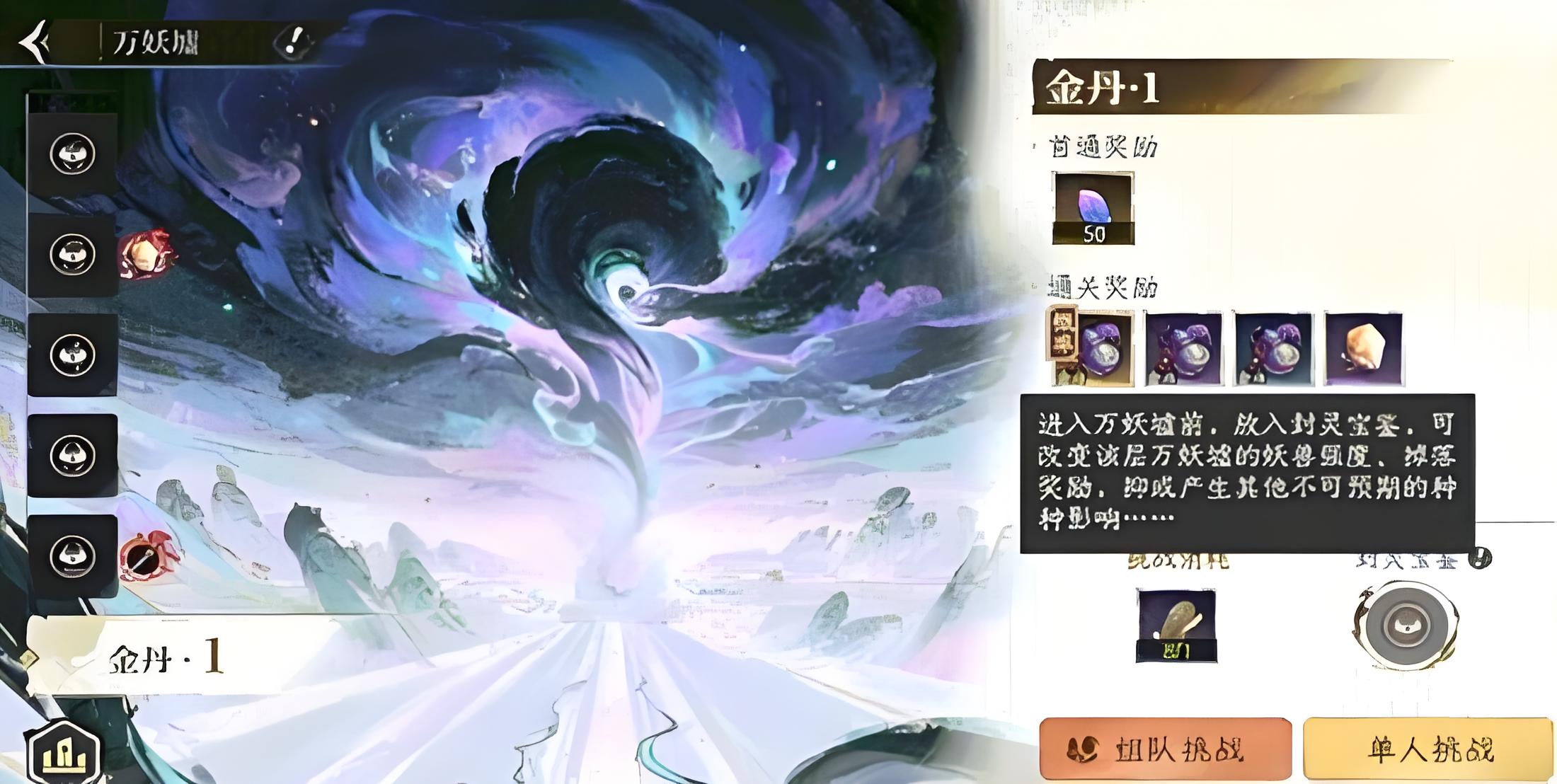4、入场前放入封灵宝鉴,可调整妖兽强度奖励类型,组队状态下还能触发赐福效果优化收益。