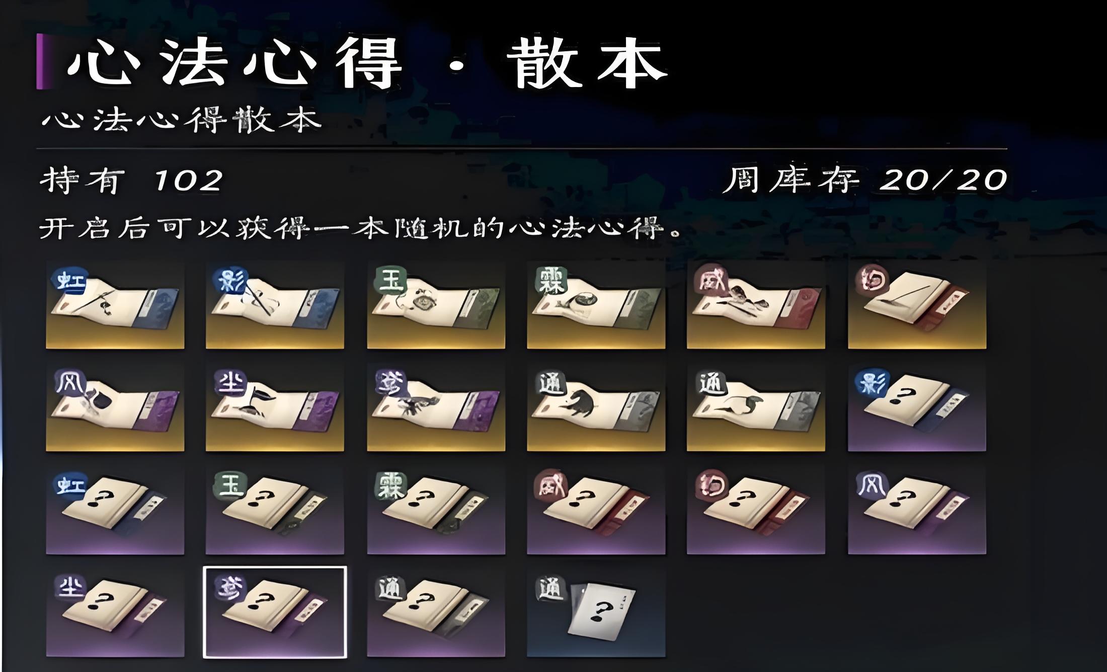 1、每周可通过不肝商店兑换固定数量心法宝箱,开启后获随机心法散本,日常活动及特定NPC处也能获取。
