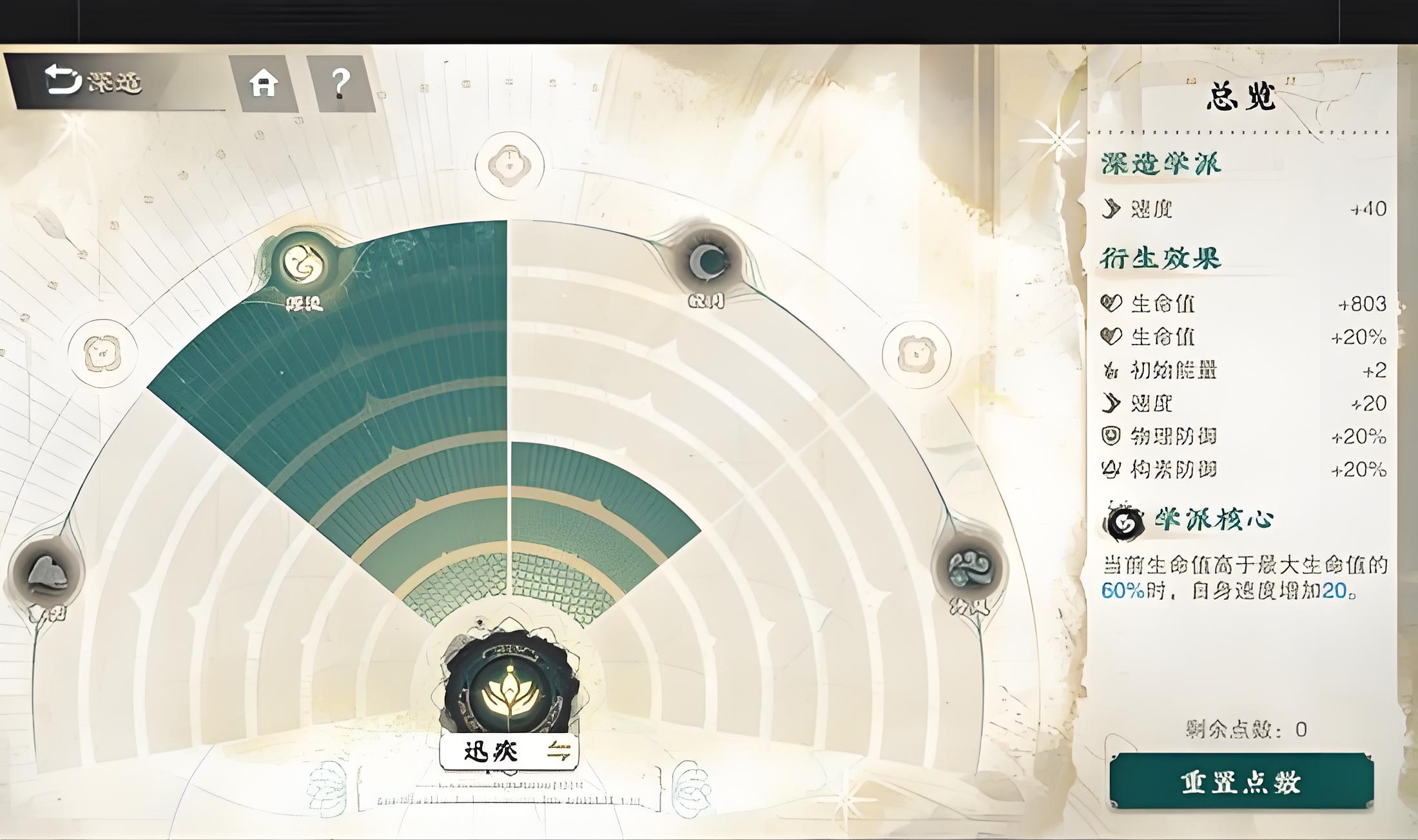 3、深造优先迅疾,配置0730或0640可获速度生命值等加成,学派核心还能额外提升速度,固防可选但非首要推荐方向。