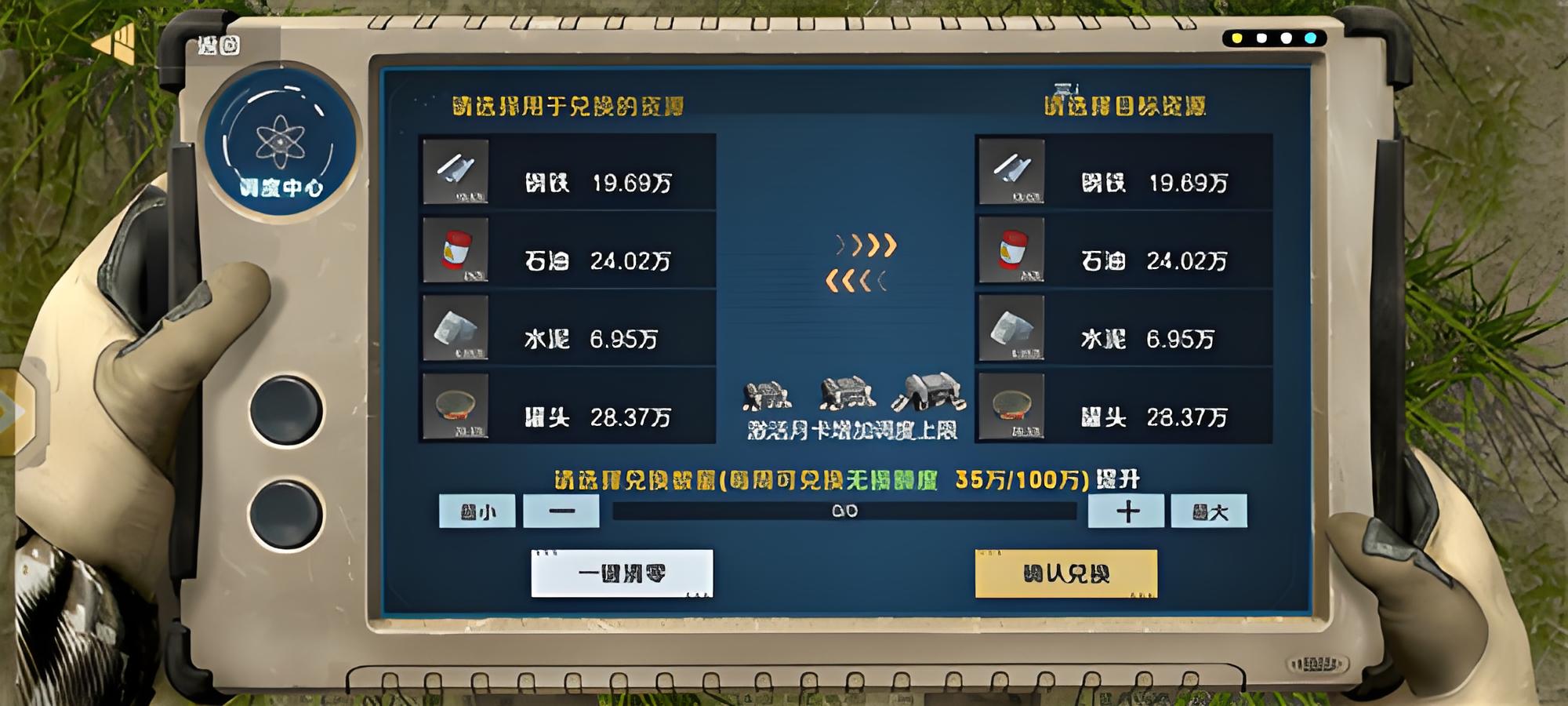 1、通过军团调度兑换水泥,需点击军团选择资源调度,选定兑换和目标资源,每周有35万无损兑换额度,激活月卡可提升调度上限。