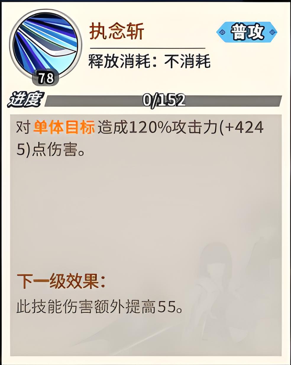 1、普攻执念斩对单体造成120%攻击力伤害,无消耗且输出稳定,作为常规战斗中的基础攻击手段。