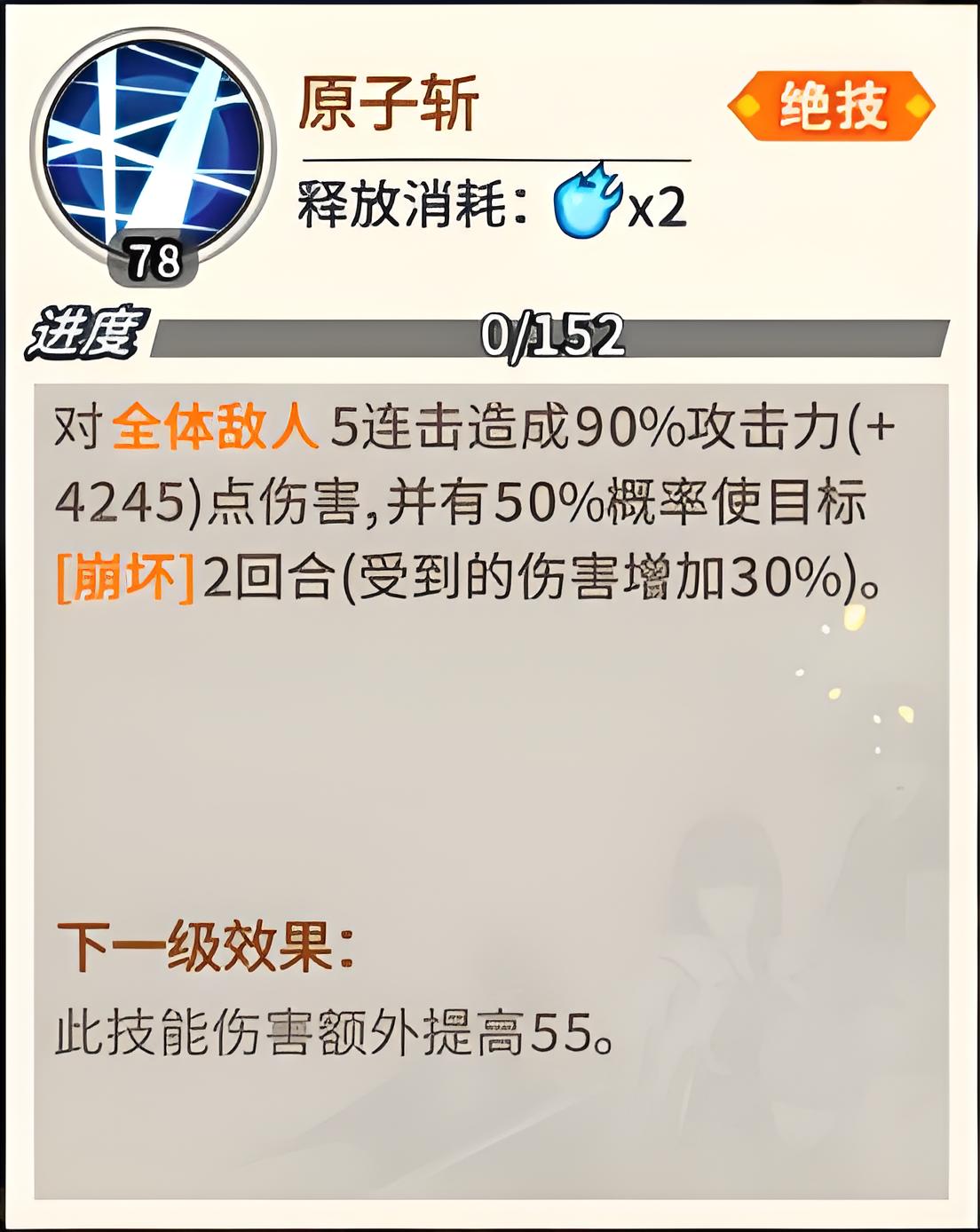 2、绝技原子斩对全体敌人5次斩击,每次90%攻击力伤害,50%概率附加崩坏使伤害增加30%。