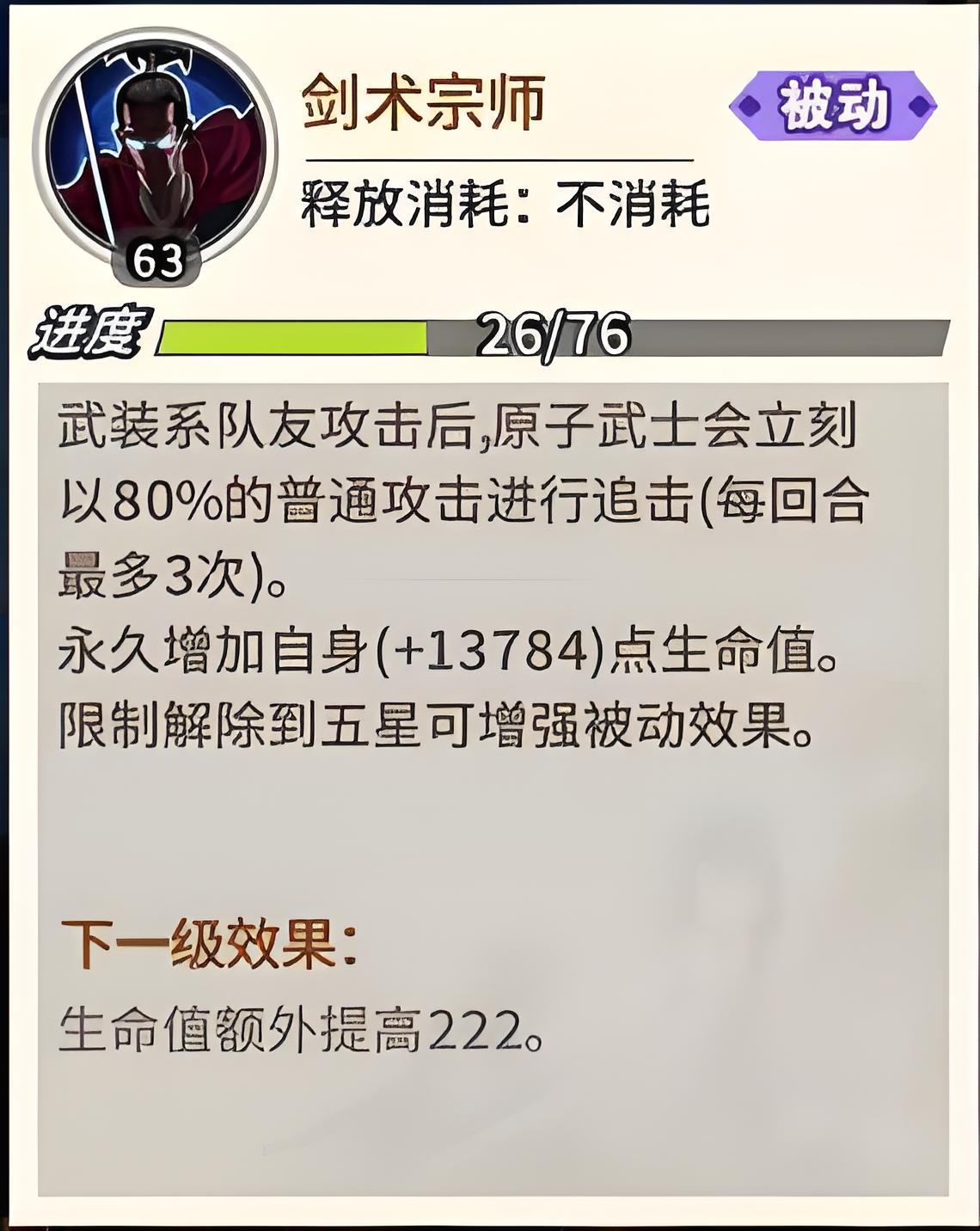 3、被动剑术宗师让武装系队友攻击后触发追击,每回合最多3次,五星解锁强化效果提升伤害。