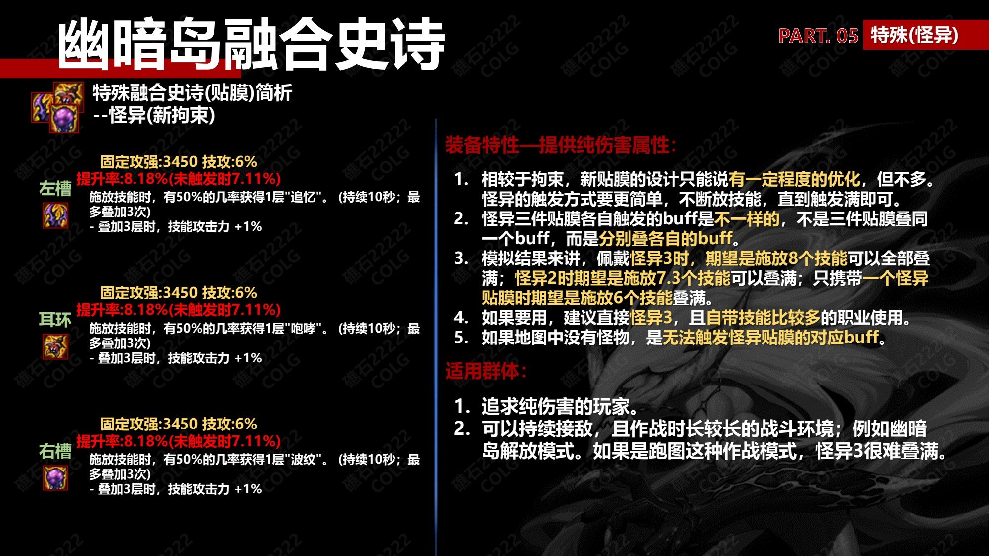 2.怪异三件贴膜各自触发的buff是不一样的,不是三件贴膜叠同一个buff,而是分别叠各自的buff,