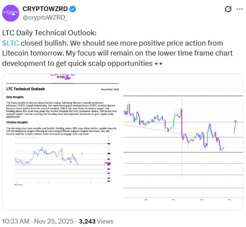 莱特币日线收阳,显示上行潜力,交易者可关注小周期 scalp 机会。来源:@cryptoWZRD_ via X