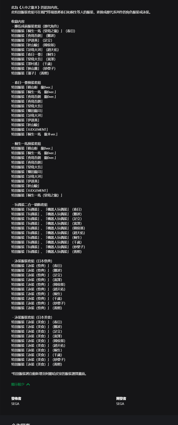 如龙8服装组合包是究极版的附加内容,玩家购买究极版可以获得服装组合包,服装组合包的所有内容可以见上图,为角色的特殊服装外观