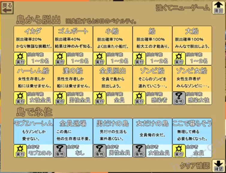 以上都完成后把女角都变成殭尸,在岛上回收这些女角僵尸完成僵尸女船脱出。再将女角全部煺场,完成男性岛永住。最后将全部男角煺场,完成全员煺场永住。
