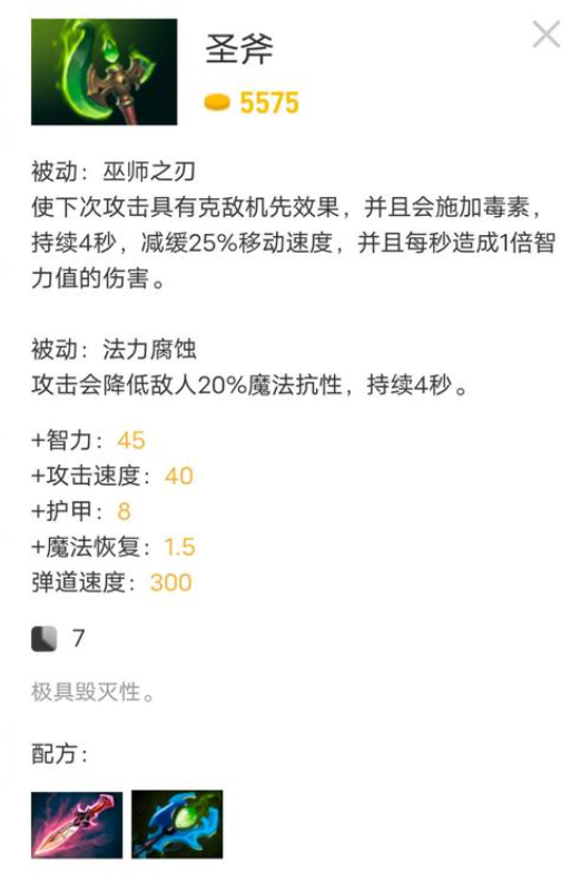 dota2圣斧合成配方是巫师之刃+神秘法杖,圣斧可以在攻击的时候减少敌人的魔法抗性,非常适合一些平A流的法师英雄出,例如蓝猫、女王、黑鸟、帕克等等