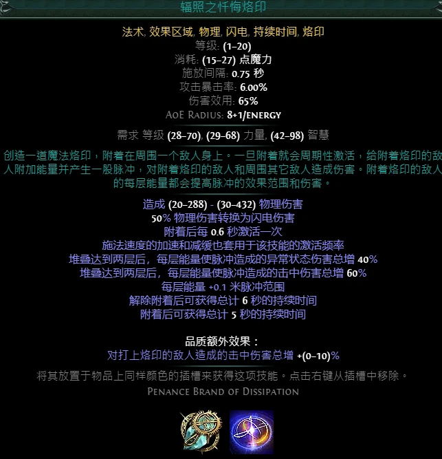 最大能量:每当辐照之忏悔烙印激活时,它都会为敌人增加 1 点能量,然后如果该敌人的能量少于 20 点,则烙印本身会获得 1 点能量。半径和伤害加成取决于烙印自身的能量,而不是所附着敌人的能量。烙印召回重置召回烙印的能量,但是“烙印每次启动时都会附着一个新敌人,每 0.3 秒只发生一次”烙印专精不会重置烙印的能量,可能允许烙印在重复附加到新敌人时达到超过 20 的能量。