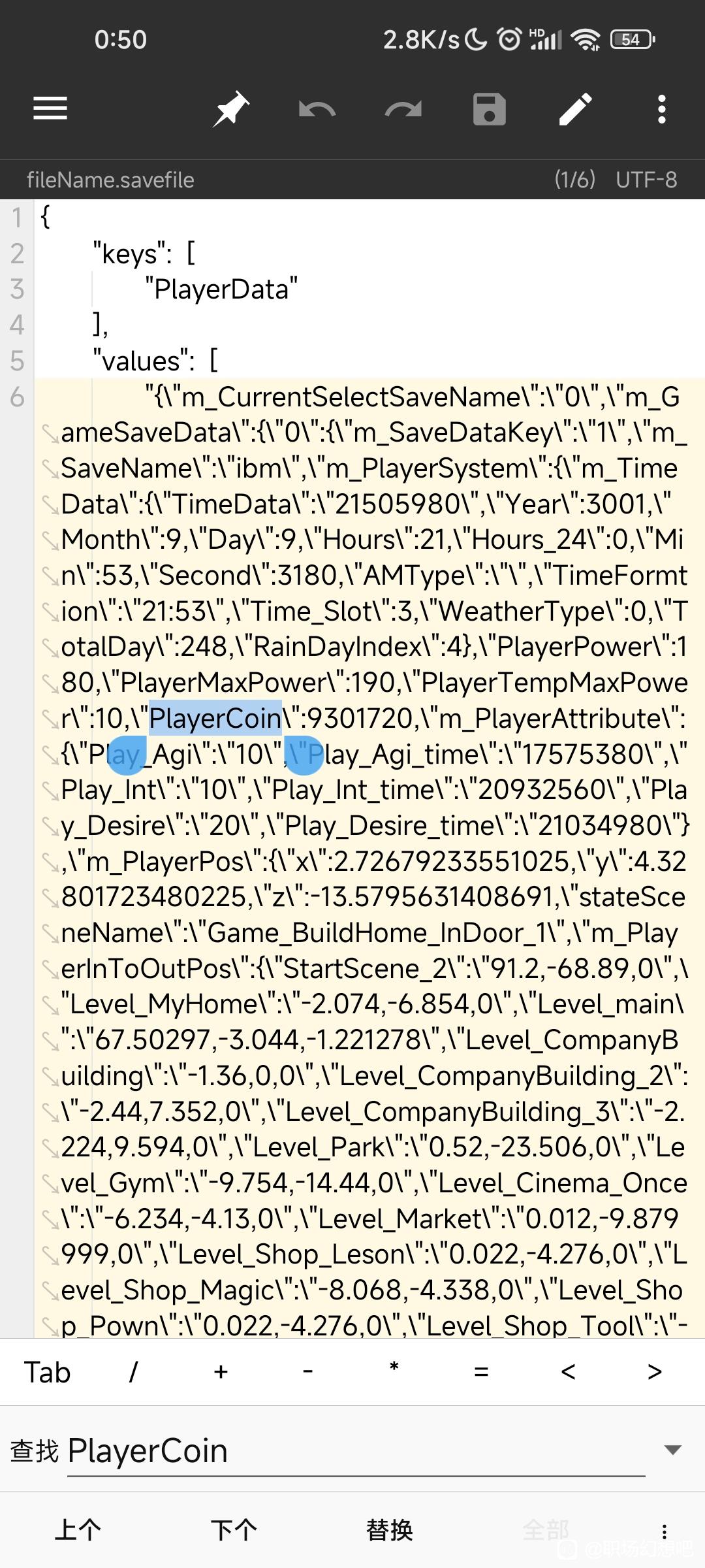 Workspace Fantasy_Data文件夹里的fileName.savefile文件,改这个文件有用,改其他的容易会掉存档,建议只改金币,以文本模式打开fileName.savefile文件,搜索PlayerCoin,只改第一个PlayerCoin后面的数字(就图上高亮位置),其他都不用改。只改这个直接999999999,然后保存退出。重新打开游戏就可以看到金钱更新了