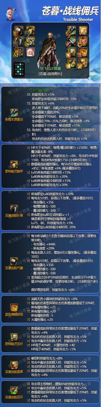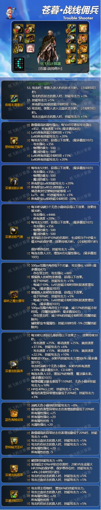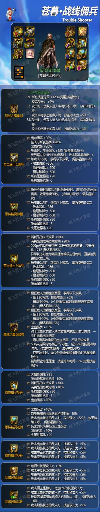 神界版本最适合佣兵的流派,高速和特化结合,缺点是手镯需要习惯每60s移动100px触发词条属性,武器贴膜异常属性根据自定义属性选择,武器贴膜1、2词条最好有-80技能cd词条