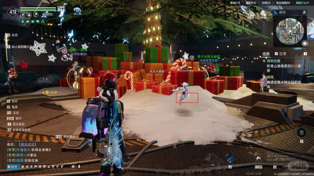 在圣诞树后面,大概这个位置,你跟着追踪来这里之后靠近会显示T切换目标,切换一下就好了。它的样子就是个发红光的小礼物盒